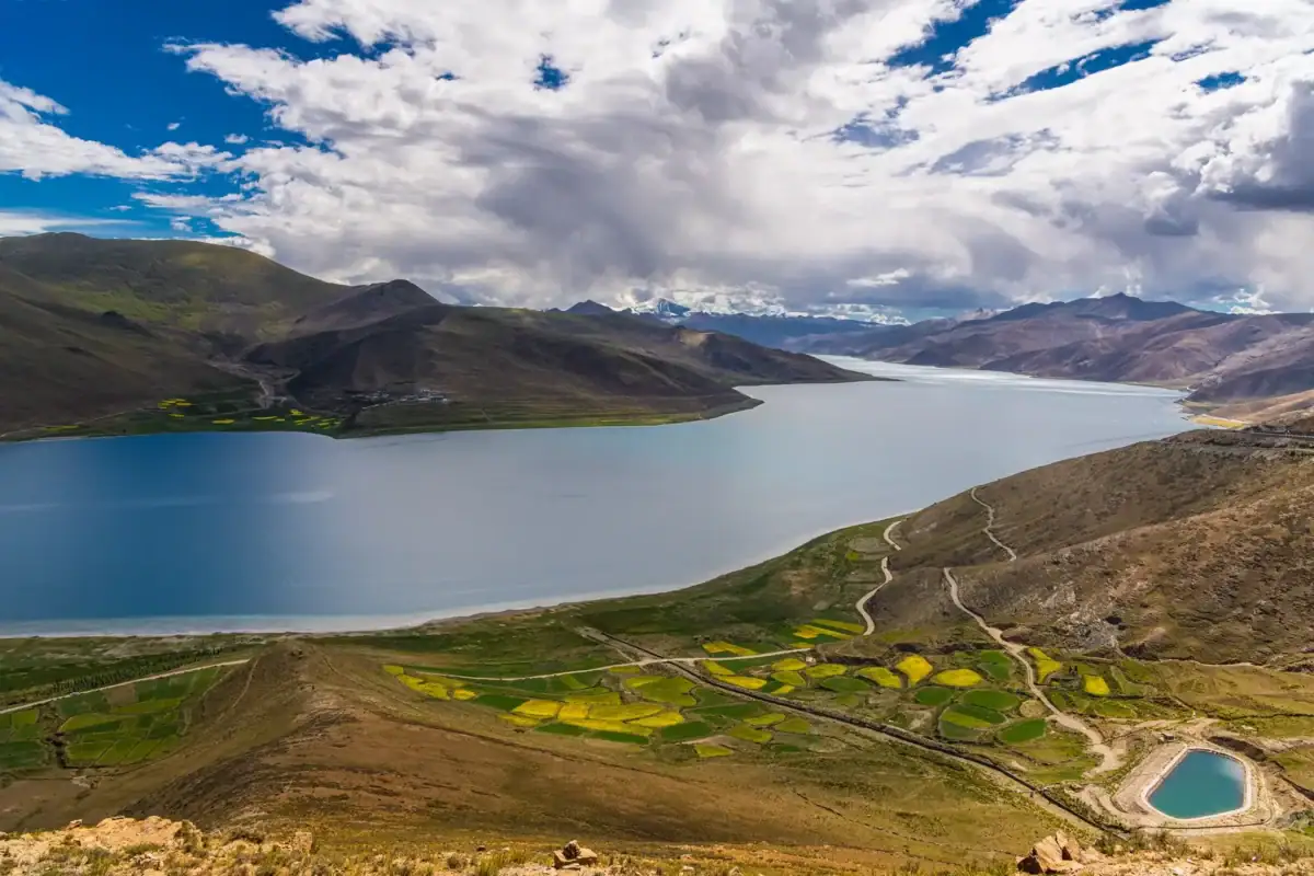 Przejedziemy wzdłuż Yamdrok Lake. To jedno z trzech największych, najświętszych i najpiękniejszych jezior w Tybecie. Kiedy słońce pada na jego wody, jezioro zmienia się w paletę barw od szmaragdowej zieleni po głęboki szafir.