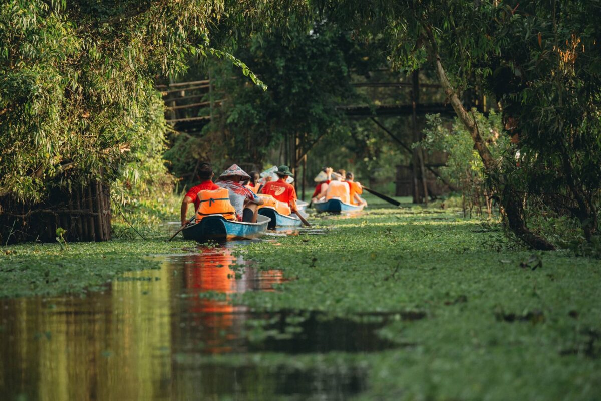 • dojedziemy rowerami aż do Parku Tra Su, do którego wejdziemy wczesnym wieczorem. Przepłyniemy w nim łodzią po rozległym systemie kanałów wiodących m.in. przez las namorzynowy. Będziemy mogli podziwiać jaskraworóżowe algi porastające konary niektórych drzew, kwiaty lotosu oraz ptaki wracające przed zmierzchem na swoje siedliska. Będziemy mogli złapać za wiosło i samodzielnie wiosłować, płynąc w niesamowitych warunkach przyrodniczych. Stąd zobaczysz drzewa herbaciane rosnące w wodach pokrytych algami o żywych kolorach